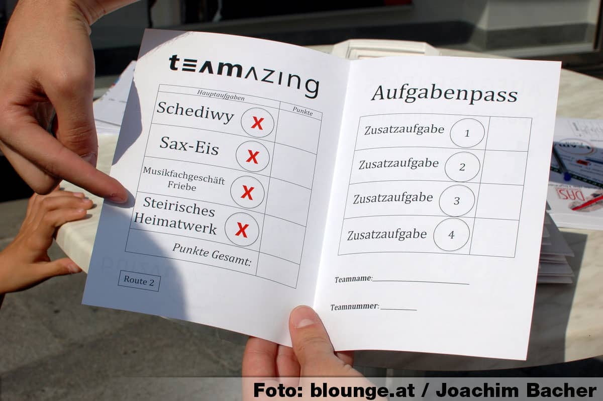 Teamazing Gassen-Challenge: Melden Sie sich vor Ort als Einzelperson oder Kleingruppe an und lösen Sie in den teilnehmenden Geschäften aufregende Rätsel und Aufgaben. Dabei sind vor allem Teamgeist, Einfallsreichtum und Geschicklichkeit gefragt. Anmeldung bei teamazing Ecke Herrengasse/Hans-Sachs Gasse. Für die Besten gibt es tolle Preise, wie zum Beispiel: eine Ausfahrt mit einem original US-Oldtimer, einen Designerteppich von Geba, GrazGutscheine, Honig und weitere kleine Aufmerksamkeiten.
